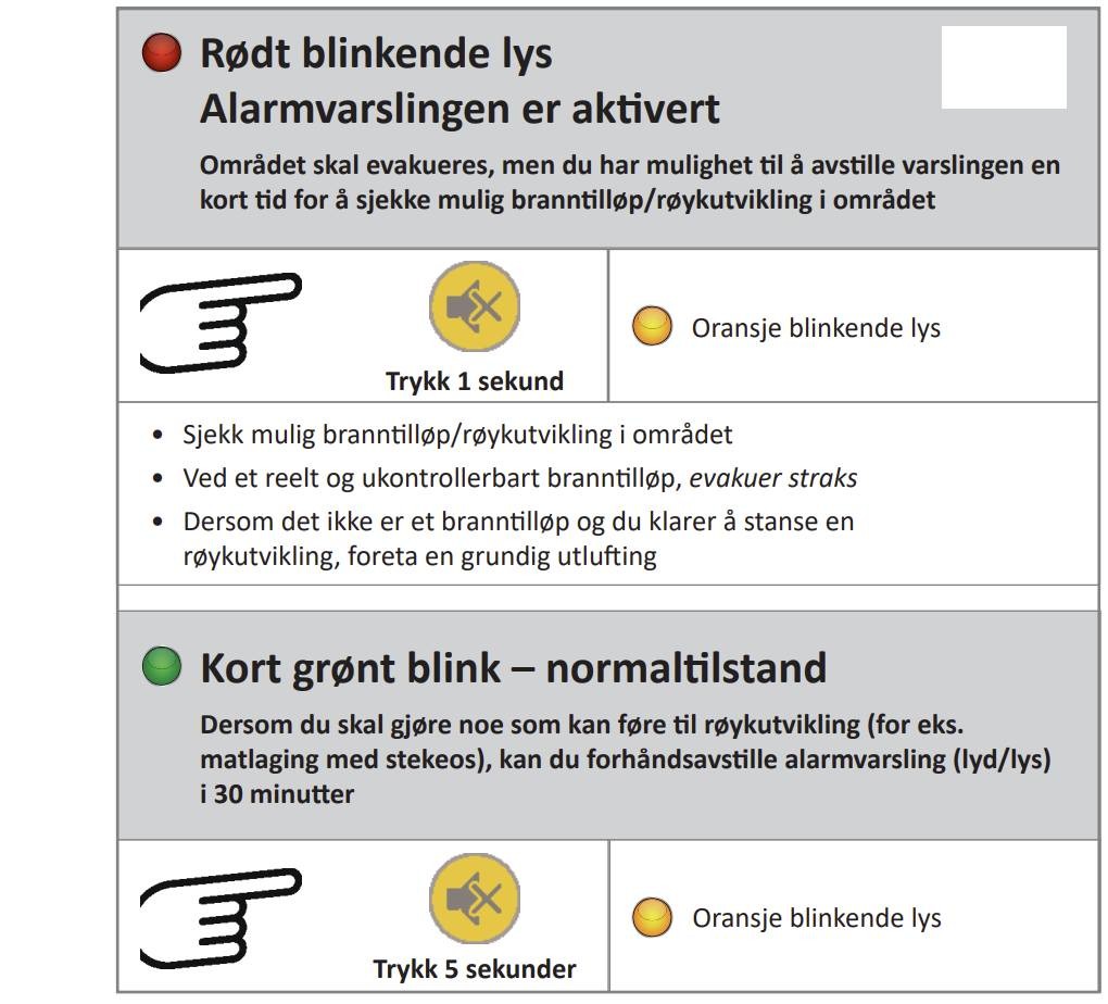 Vær så snill og les bruksanvisningen og sørg for at alle i husstanden kan den. Det som ikke står i den er at dersom alarmen er utløst så har du 2 min til å trykke for å stoppe den. Trykk på gul knapp i 1 sekund.