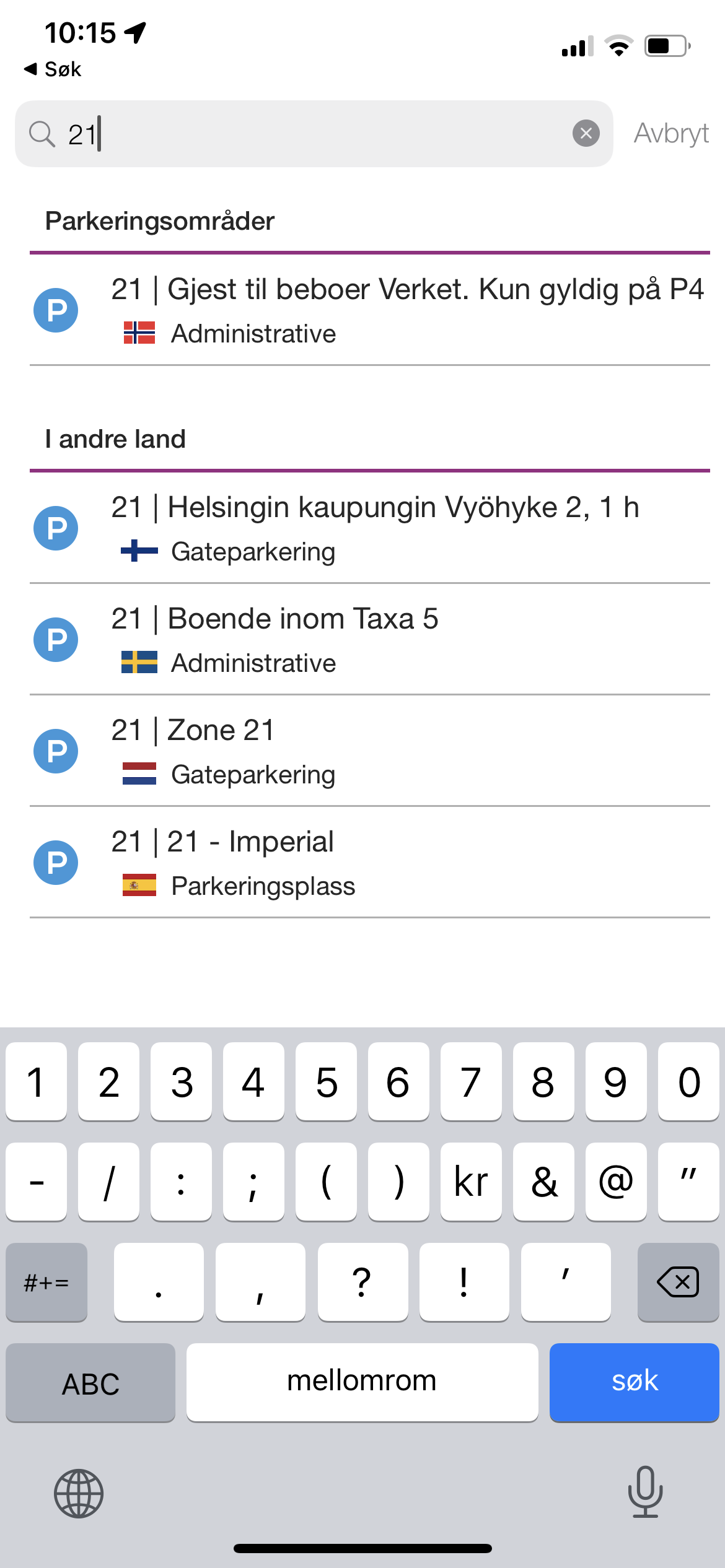Man skriver koden i søkefeltet i app-n og velger så parkeringsområde 21 som kommer øverst på bilde 2.